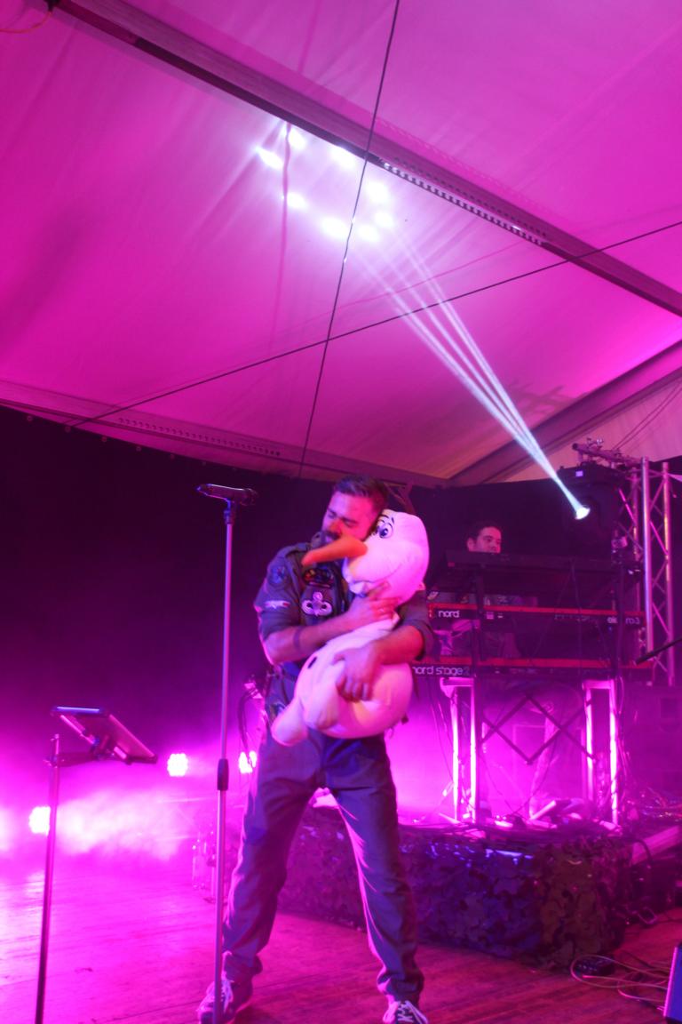 Dann hieß es warten. Doch wir warteten nicht lange und um 21.20h zählten wir die ersten Takte. Die Woge aus tiefen Basstönen, Gitarrenkreischen, Drums und Keyboardinfernal türmte sich hinter uns auf, brach über uns zusammen und risse uns mit in einen Strudel aus Musik und Ekstase. Das Publikum wurde ebenso mitgerissen und gröhlte, klatschte und sang mit vom ersten Takt bis zum allerletzten Ton. Zwischendurch kam Charlie Gh. dem Wunsch der Kirmesjugend nach und es wurde geheiratet.
